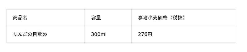 インパクトのあるりんごのパッケージから想像されるイメージ通り、りんごのおいしさがたっぷり味わえるドリンクにできました。口いっぱいに広がる、目覚めたりんごのおいしさをお楽しみください。