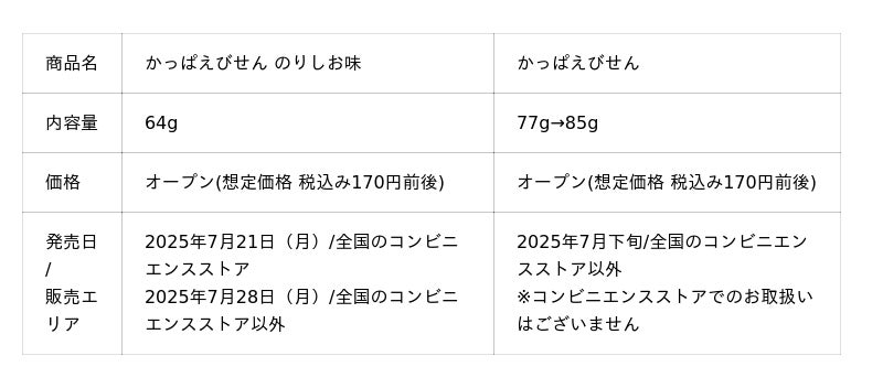 カルビー株式会社(本社:東京都千代田区、代表取締役社長兼CEO:江原 信)は"やめられない、とまらない♪"でおなじみのロングセラー商品「かっぱえびせん」より、えびの風味と青のり、焼きのりの2種類ののりが絶妙にマッチした新商品『かっぱえびせん のりしお味』を、2025年7月21日(月)から全国のコンビニエンスストア先行で期間限定発売します。コンビニエンスストア以外の店舗では、2025年7月28日(月)から発売します(同年11月上旬終売予定)。また、8月10日の「かっぱえびせんの日」を記念し、内容量を10%増量した「かっぱえびせん」を2025年7月下旬から全国のコンビニエンスストア以外の店舗で期間限定発売します(2025年8月下旬終売予定)。