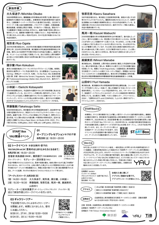 内容:START Boxで活動するアーティストが制作した作品等を展示。ギャラリーツアー、ゲストを交えた出展作家とのディスカッション、トークイベント等も実施。