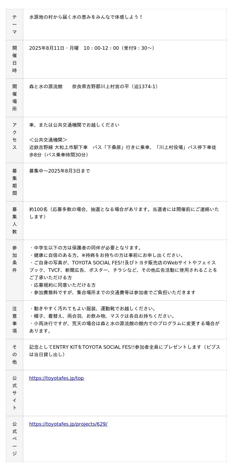 【8月11日開催】奈良会場<源流の豊かな森と水を未来へつなごうプロジェクト>の参加者を募集中~TOYOTA SOCIAL FES!!2025~