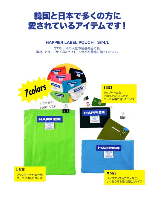 Happier label pouch S/M/Lオーロリーデイの人気定番商品。素材、カラー、サイズのバリエーションを豊富に取り揃えています。Sサイズは小さなコスメやカード収納用の財布として、Mサイズはよく使う持ち物用のポーチとして、Lサイズはブックポーチや旅行用ポーチとしておすすめです。