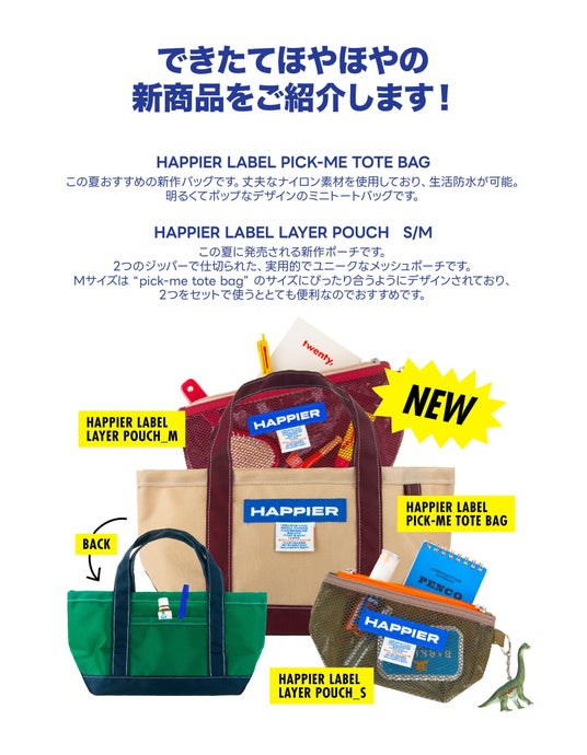 Happier label pick-me tote bag ¥7,821 (税込) Happier label layer pouch Sサイズ ¥4,070 (税込)Mサイズ ¥4,708 (税込)