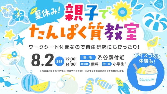 "タンパク質ってなに?"をテーマにした自由研究講座。ワークシートをそのまま学校に提出できる構成で、夏休みの宿題対策にもぴったりです。