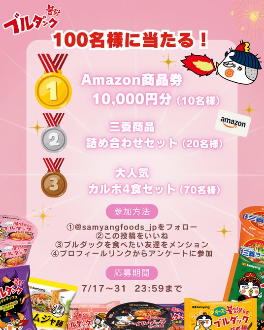 期間中、上記アカウントにて公開されたリンクより「ブルダックに関するアンケート」にご回答いただいた方の中から抽選で、Amazon商品券1万円分(10名様)、三養食品詰め合わせセット(20名様)、圧倒的な人気を誇るフレーバー「カルボブルダックセット」(70名様)など、総計100名様に豪華なプレゼントを提供いたします。