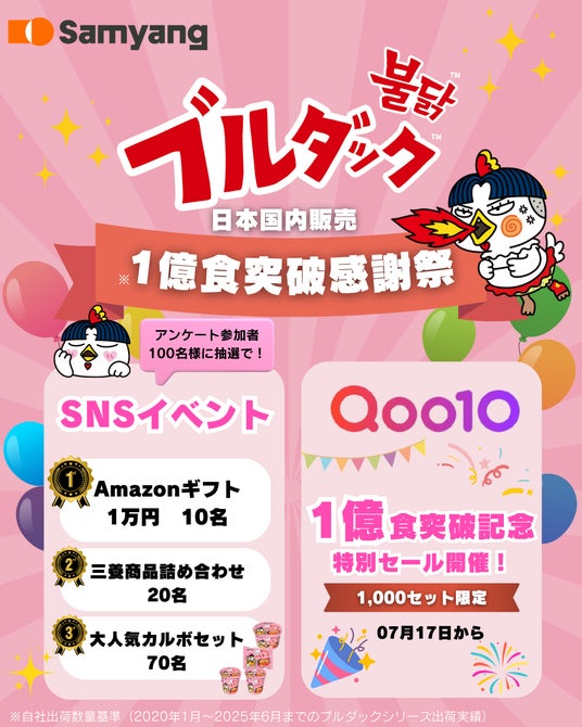 フードやドラマ、ファッションなどのKコンテンツブームとの相乗効果もあり、ブルダックは25年上半期時点で日本国内累計販売数((1)※)1億食を突破しました。三養ジャパンは1億食突破を記念し、「1億食突破感謝祭」を7月17日から7月31日まで実施いたします。