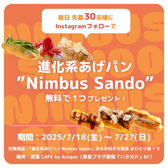 内容:毎日先着30名様に「進化系あげパンNimbus Sando」1個を無料でプレゼント