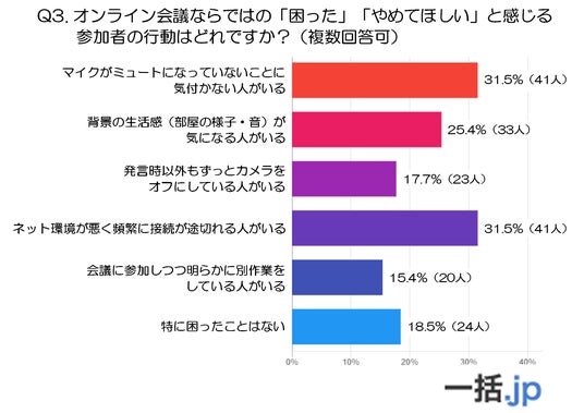 - 最も多かったのは、「マイクがミュートになっていないことに気付かない人がいる」と「ネット環境が悪く頻繁に接続が途切れる人がいる」で、いずれも31.5%(41人)でした。音声トラブルや通信不安定は、オンライン会議ならではの大きなストレス要因となっています。