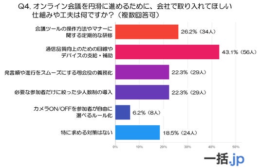 - 最も多かったのは、「通信品質向上のための回線やデバイスの支給・補助」で、43.1%(56人)が挙げています。オンライン会議の円滑な実施には、まず通信環境の安定やデバイスの充実が重要であると、多くの参加者が感じていることがわかります。