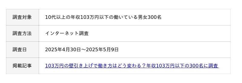 エフアンドエムネット株式会社(本社所在地:大阪府吹田市、代表取締役社長:上枝康弘)は、管理部門向けのビジネスメディア「労務SEARCH(労務サーチ)」にて、年収103万円以下の男女300名を対象に、103万円の壁の引き上げに関するアンケート調査をおこないました。