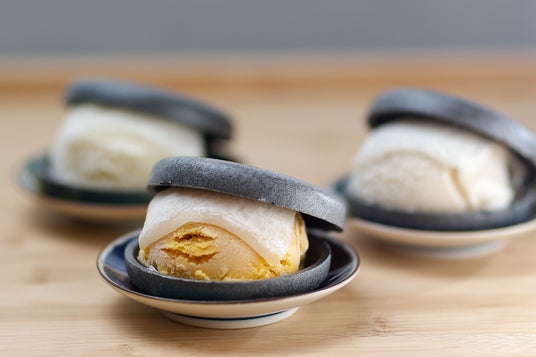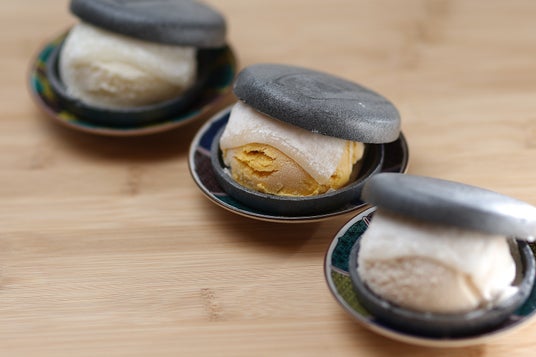 中に包まれるのは大福とジェラート:国産もち米の求肥で丁寧に包み込まれた大福が、濃厚なジェラートと一体となり、ひと口で3つの食感を楽しめます。