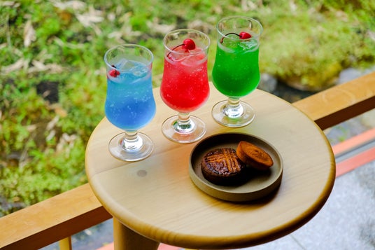 コラボグルメ一例。『カラフルソーダとこだわり素材の焼き菓子 コースターセット(税込1,500円)』