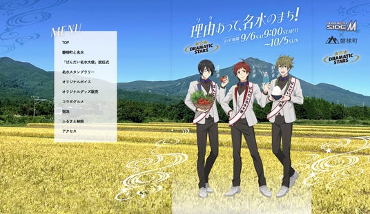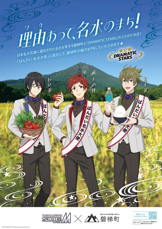 今回コラボレーションするのは、福島県出身の天道輝(てんどうてる)がリーダーを務める『DRAMATIC STARS』の3人のアイドル。ばんだい名水大使オリジナル衣装を纏った3人は、名水のまちをPRしながら、9月6日(土)~10月5日(日)までの約一ヶ月間、様々な企画でプロデューサー(ファン)の皆様をお迎えします。また、9月6日(土)には特別就任ボイスを使用した『ばんだい名水大使就任式』も開催予定。磐梯町が注目される一ヶ月となります。