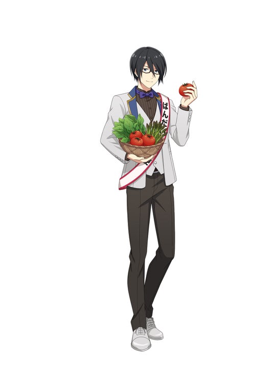 ばんだい名水大使のイラストは、磐梯町限定のオリジナルデザインです。それぞれのアイドルが、磐梯町の名水をボトリングした『ばんだい山の天然水』(中央)、磐梯町の名水で育つ野菜(左)、米(右)を手に持ち、蝶ネクタイには町の花である『りんどう』の紫があしらわれています。