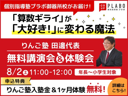 CKCネットワーク株式会社(本社:愛知県名古屋市名東区 代表:山崎朋宏)が運営する、「個別指導塾プラボ」にて、算数のプロフェッショナルである「りんご塾」の田邉代表が講演会を開催します。