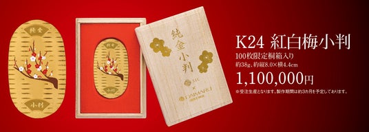 株式会社SGCには、福岡の県花である「梅」をデサインした純金小判をお持ちいただきました。梅は厳しい寒さの中で他の花より最も早く開花することから「出世」や「開運」などの象徴とされ、一本の木に紅と白の梅の花が咲く紅白梅はより一層縁起のよいものとして親しまれています。同じく金箔で「梅」をあしらった特別仕様の限定桐箱にてお納めいたします。