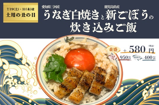 焼肉KINTANをはじめとするレストラン17店舗では「愛知県産うなぎの白焼きと鹿児島県産新ごぼうの炊き込みご飯580円」を販売いたします。牛肉と鰻の美味しさを同時に堪能できる贅沢なスタミナ飯です。夏のご褒美として是非お楽しみください。