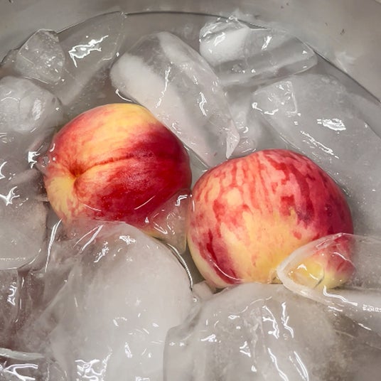 氷水で一気に冷やすします。急冷することで果汁を閉じ込め、フレッシュな状態をキープ。ここで桃の風味が決まります。