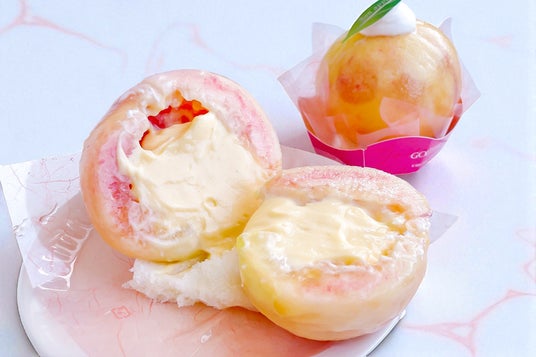 桃を割れば、じゅわじゅわと果汁があふれ出し、中にはパンパンに詰まった大人気カスタードが!