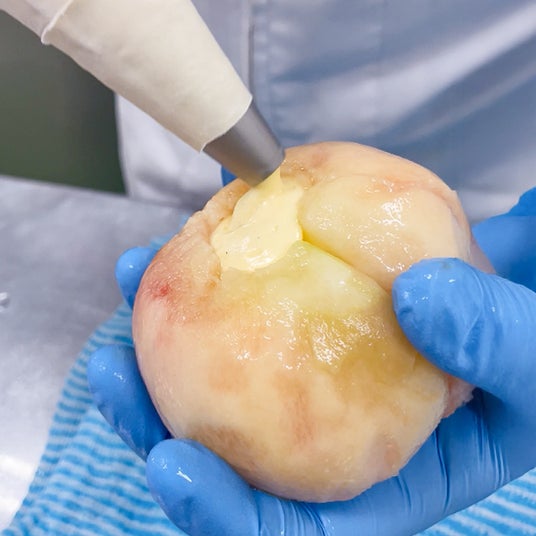 大ぶりの桃にたっぷり詰まった、このとろけるカスタードクリームの贅沢なハーモニー。