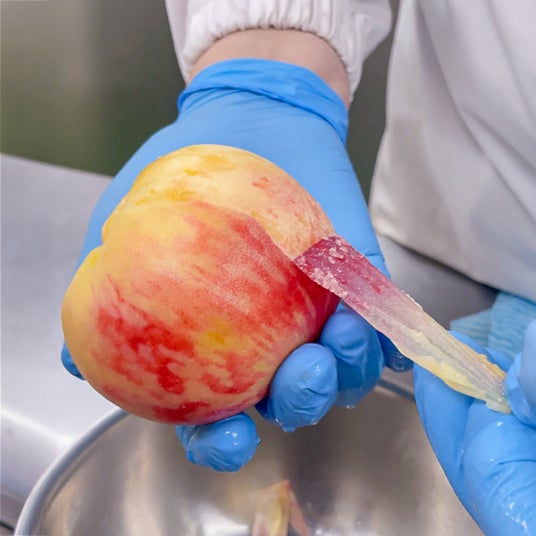 「まるごと桃」は、皮むきから仕上げまで、すべてが丁寧な手作業。