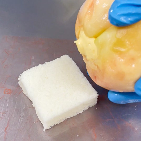 「まるごと桃」を真っ二つに割れば、思わず「わっ!」と声が出るほどの驚きの量のカスタード。すみずみまでパンパンに、カスタードがこれでもか!とギュッと詰め込まれています。なぜ、そこまで贅沢に詰め込むのか?