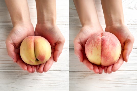 左側に持つ桃は、街の八百屋さんでもよく見かける、一般的な桃のサイズ。そして、右側に堂々と鎮座するのが、お菓子のたいようの【まるごと桃】のために、特別に厳選された桃なんです。