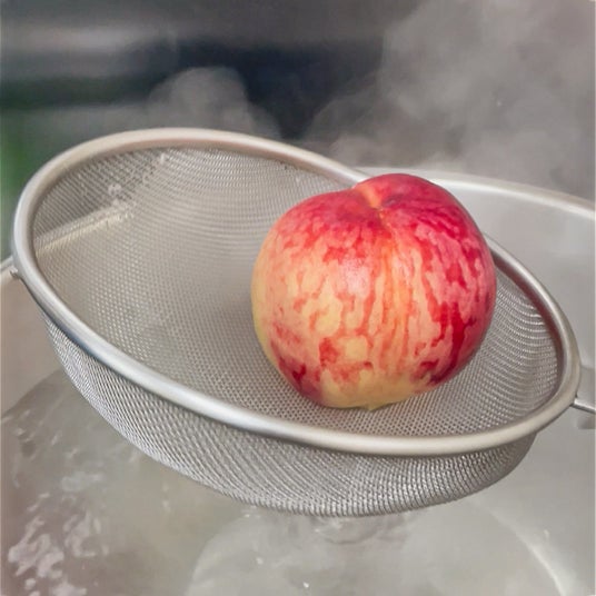 ほんの数秒の湯通しで、皮をむきやすくし、果肉への負担も最小限に。加熱しすぎず、桃の持つみずみずしさをそのままに保つ、絶妙な温度と時間の見極めが鍵です。