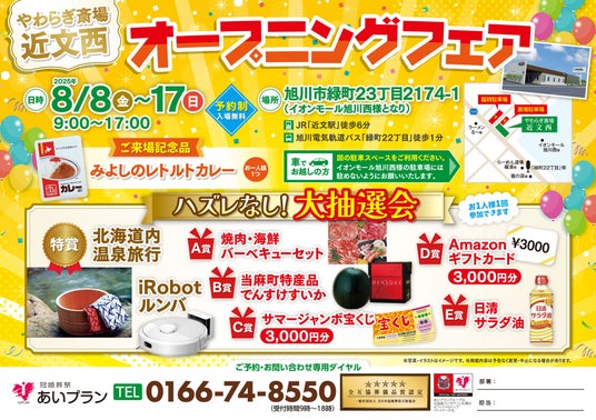 株式会社あいプラン(北海道札幌市)は、旭川市内における新たな家族葬向け葬儀場として「やわらぎ斎場近文西(ちかぶみにし)」を2025年8月8日(金)にグランドオープンいたします。