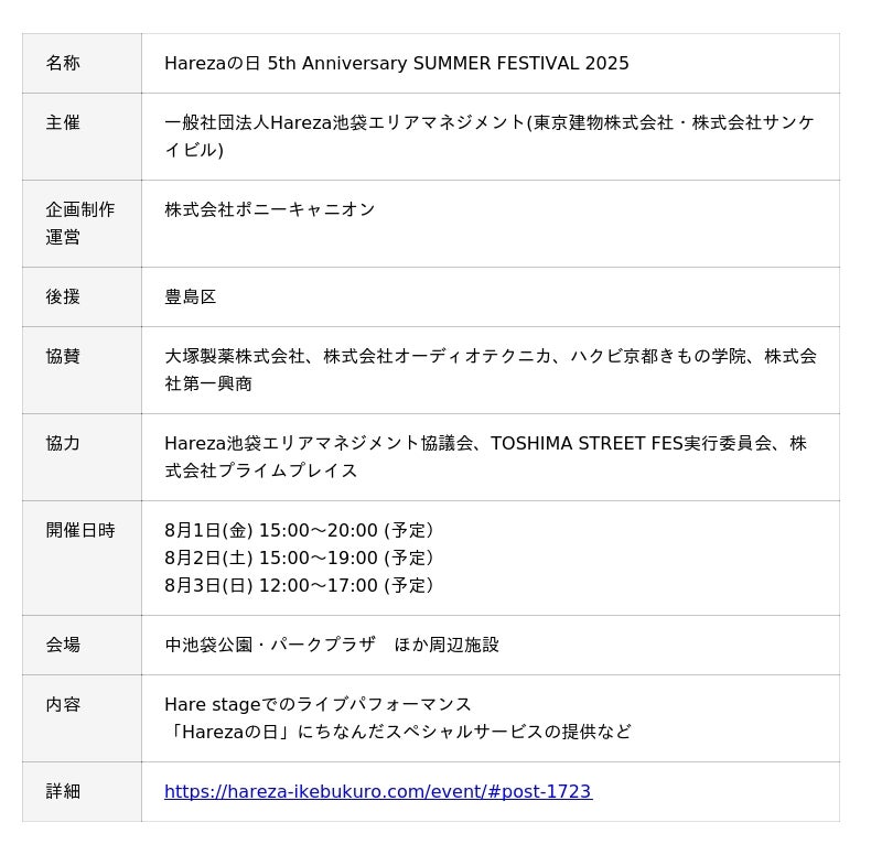 東京建物株式会社と株式会社サンケイビルの2社が事務局を務める一般社団法人Hareza池袋エリアマネジメントは、2025年8月1日(金)から8月3日(日)までの3日間、「Hareza池袋」グランドオープン5周年を記念し、『Harezaの日 5th Anniversary SUMMER FESTIVAL 2025』を開催します。