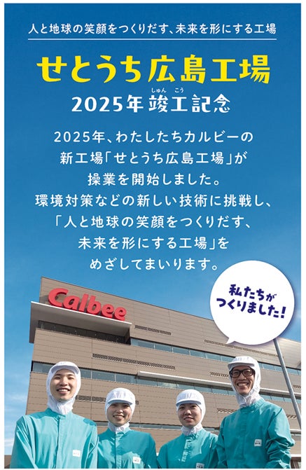 この度、多くの方々のご支援を賜りせとうち広島工場を竣工することができました。広島はカルビーの創業の地です。せとうち広島工場が地域の誇りとなるよう、これからも地元のみなさまとともに歩んでまいりたいと思います。