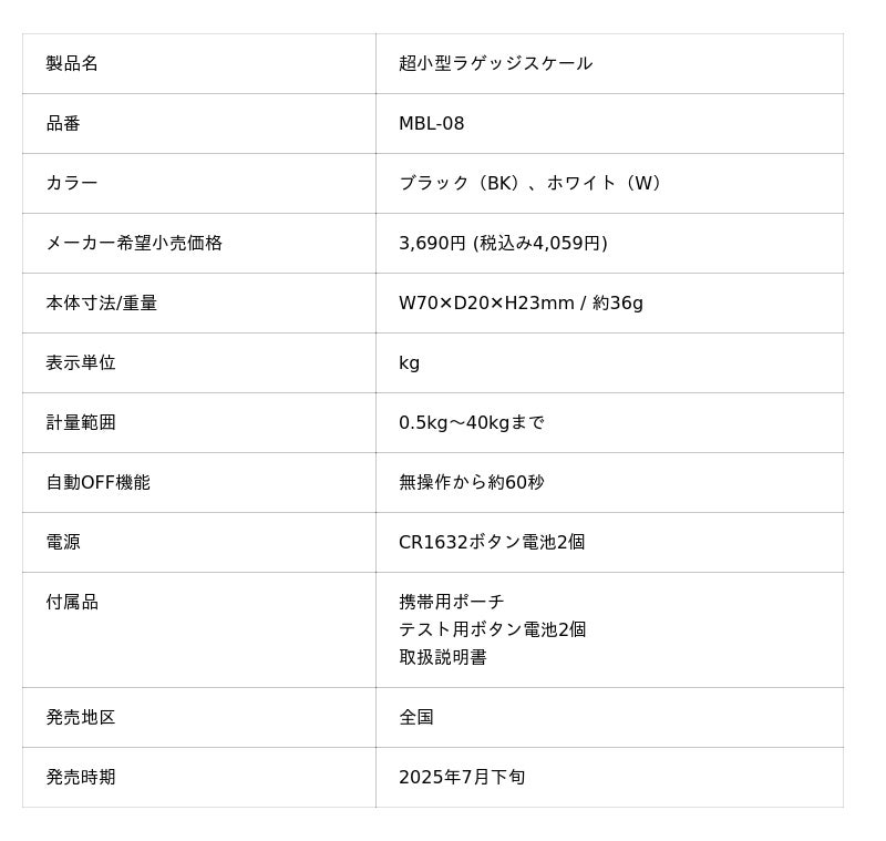 ナカバヤシ株式会社(本社:大阪市中央区、社長:中林一良)は、小さくて携帯しやすい「超小型ラゲッジスケール」計2品番を2025年7月下旬より全国で順次発売します。