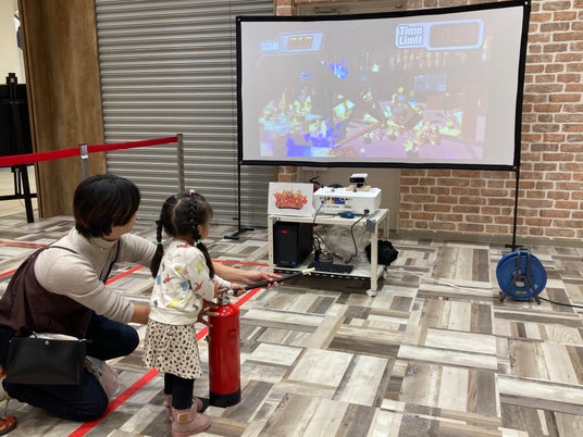 消火器で火を消す要領で、スクリーンに映し出された炎の消化体験を行います。消火器の扱いや火災時の対応を学べます。