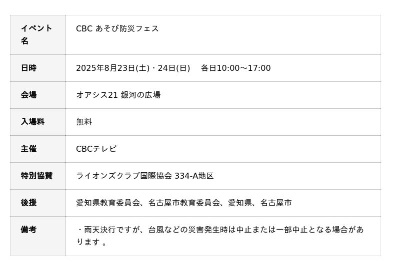 株式会社CBCテレビは、2025年8月23日(土)と24日(日)の2日間、名古屋市・栄のオアシス21 銀河の広場で、親子で防災を楽しく学べるイベント「CBC あそび防災フェス」を開催します 。参加は無料で、夏休み後半、自由研究のヒントにもなるような「あそび×まなび」の場を提供します 。