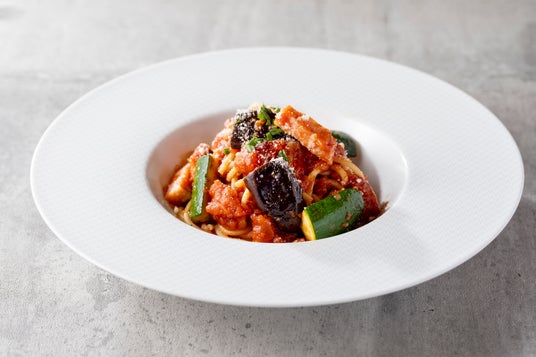 ・<中央>【7/21(月)~8/3(日)限定】燻製ベーコンと夏野菜のトマトスパゲッティ … 980円(税込)/<お子様サイズ> 600円(税込)