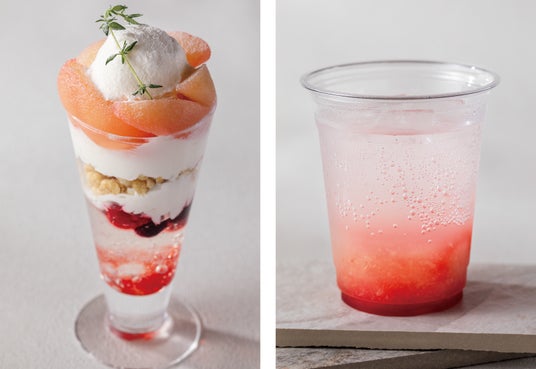 ・<左>鏡石町産桃とヨーグルトアイスのさっぱりパフェ … 各880円(税込)
