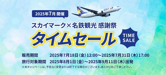 名鉄観光サービス株式会社(本社:愛知県名古屋市、代表取締役社長:岩切道郎、以下名鉄観光)は、2025年7月18日(金)12:00~2025年7月31日(月) 17:00の期間中、スカイマークのダイナミックパッケージ商品を対象とした「スカイマークタイムセール×名鉄観光感謝祭」を開催いたします。