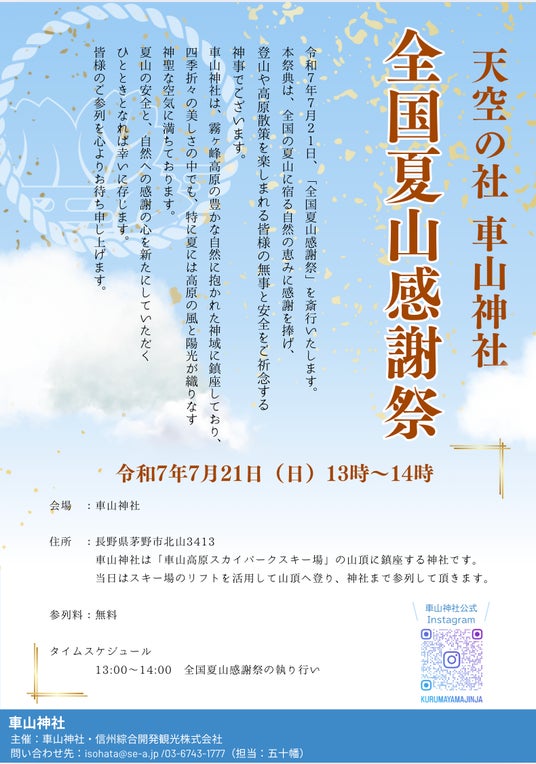 一般社団法人 日本文化伝承協会(所在地:東京都渋谷区/代表理事:宮澤伸幸)は、2025年(令和7年)7月21日(月・祝)に、長野県茅野市の霧ヶ峰高原・車山神社にて「全国夏山感謝祭」を執り行います。