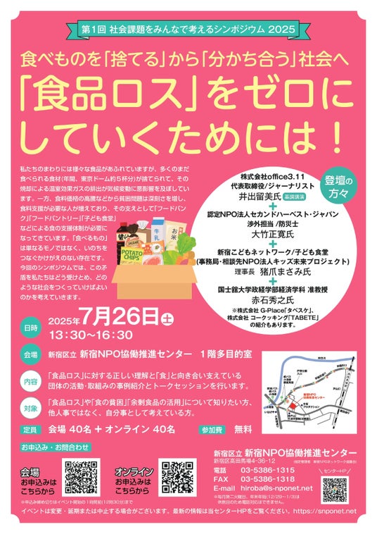 第1回 社会課題をみんなで考えるシンポジウム 2025「食品ロス」をゼロにしていくためには!~食べものを「捨てる」から「分かち合う」社会へ~』を7月26日(土)、新宿区立新宿NPO協働推進センターにて開催します。