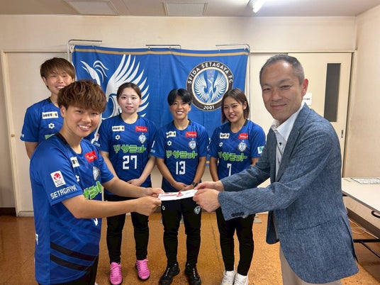 スフィーダ世田谷FCの選手を代表して、#3柏原美羽選手、#7渡邊那奈選手、#9堀江美月選手、#13内田美鈴選手、#27佐藤李那選手が寄付金を受け取りました。