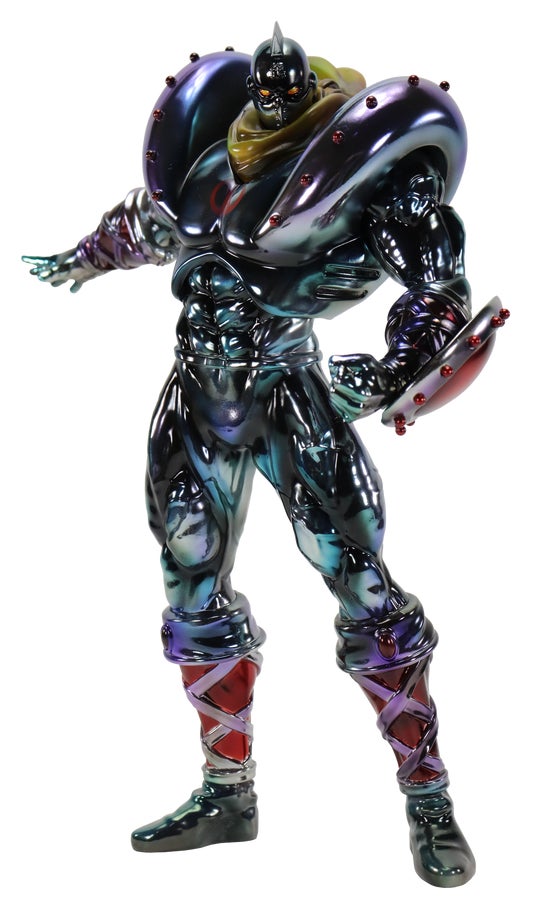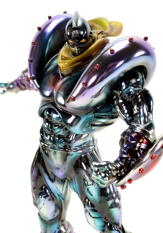 通常では商品化が難しいソフビ素材への特殊メッキ加工を施したボディに、秘められた冷徹なイメージを感じられるようなパープルのグラデーションや、陰影の塗装が施されています。