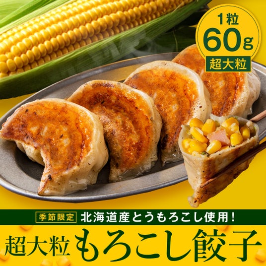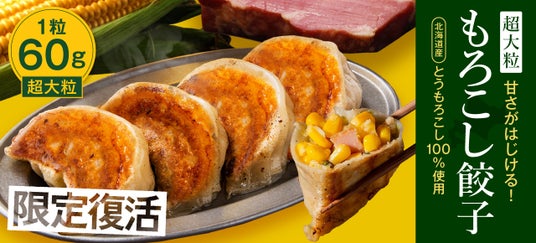 『超大粒もろこし餃子』は、甘さはじける北海道産とうもろこしをたっぷり使った餃子です。2022年夏に期間限定で登場した際、とうもろこしの甘さと食感で瞬く間に完売。この幻の人気餃子が、3年振りに期間限定で登場いたします。