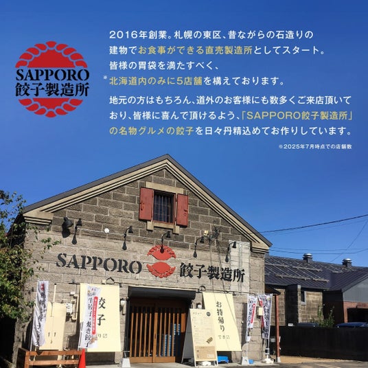 札幌の東区、昔ながらの石造りの建物ではじまった、お食事ができる餃子の製造直売所。地元の皆様や、道外から訪れた皆様も、餃子を求めてこの製造所を訪れます。北海道の素材を使い、北海道の文化に合わせて探求した餃子は、厚いのに口当たりの良い独自の食感の皮と、手間隙をかけて仕込んだ具材が自慢です。特別だけど、どこか懐かしく身近な味。製造所直売のできたて餃子を、皆様にお届けします。