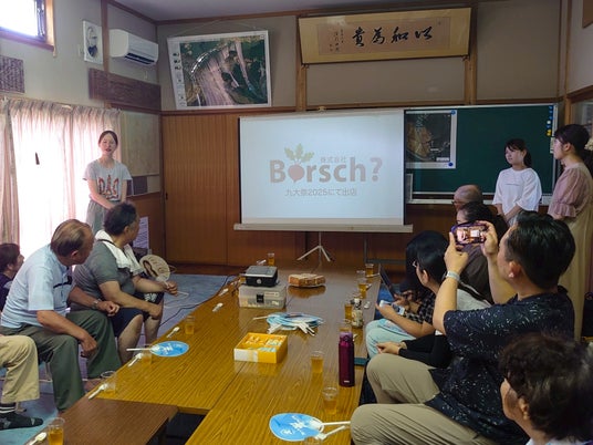 今回の企画は、九州大学の起業体験プログラム「QSHOP」から誕生した学生ベンチャー《株式会社Borsch?》によるもので、横枕地区で栽培されたビーツを使用し、本格的なウクライナ料理が振る舞われました。