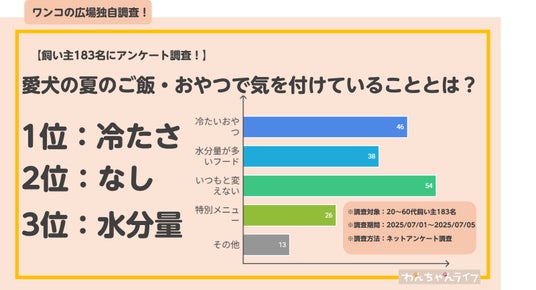 この結果から、夏でも基本の食事は変えずに安定を重視する飼い主さんが多い一方、冷たいおやつや水分補給を意識したメニューを取り入れる家庭も多いことが分かります。