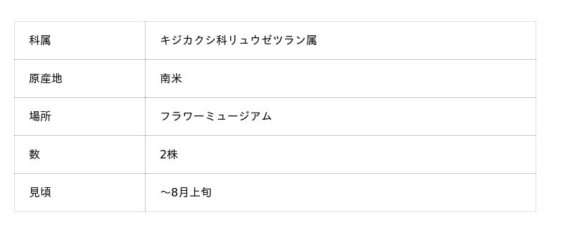 アオノリュウゼツランは数十年かけて成長し、一度咲いたら枯れてしまいます。昨年開花した個体の切り株も近くで観察でき、茎の太さとともにその生命力を感じることが出来ます。