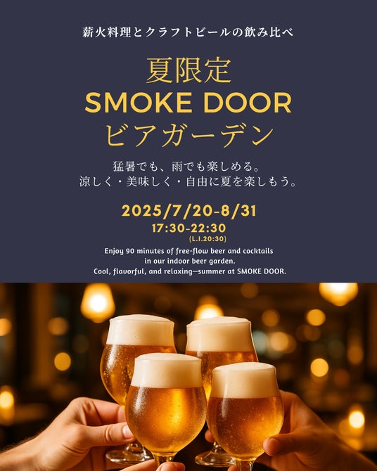 株式会社BOND CREATION(代表取締役 雨宮龍)が運営する横浜駅西口徒歩5分・HOTEL THE KNOT YOKOHAMA 1階の薪火レストラン2025年7月20日(日)~8月31日(日)の期間限定で「SMOKE DOOR BEER GARDEN」を開催します。