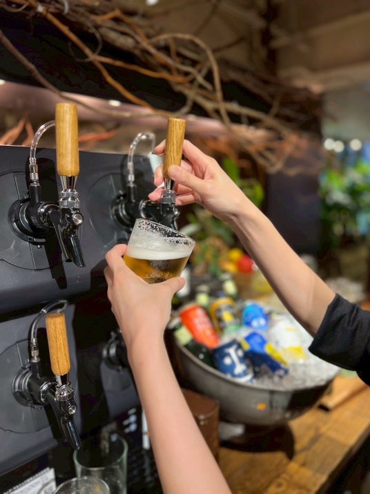 薪の香りと涼しい店内で生ビール4種をセルフサーブできるほか、スパークリングワインやオリジナルカクテルなどを90分フリーフローでご用意。