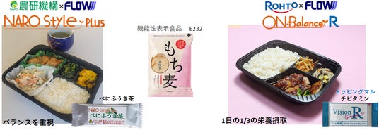 ・NARO StylePLUS:農研機構の登録商標「NARO Style(R)」を冠した商品で、機能性表示食品のもち麦を利用したご飯、「べにふうき茶」をセットした健康食 ・ON Balance R:ロート製薬が開発した「Vision R」をセットにしたお弁当