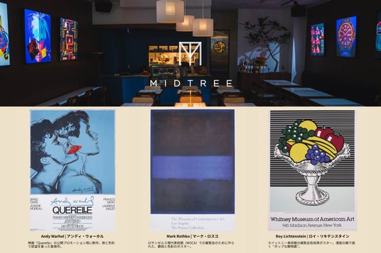 3ヶ月に一回変わる、MID TREEこだわりのアート展示、心地よいBGMが調和した洗練の空間で、訪れるすべての方に "食事の時間を特別なひとときに変える" 体験をお届けしています。