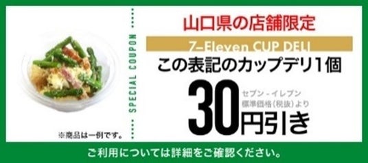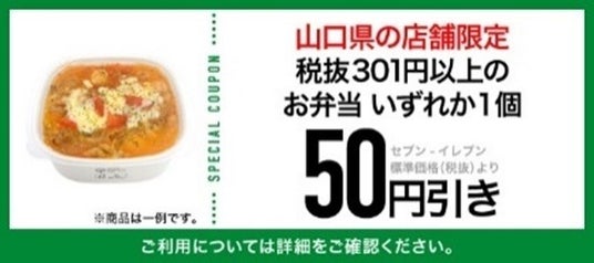 2.期間中301円(税抜)以上の対象の「お弁当」を買うたびに次回使える50円引きクーポンを1枚、また、対象の「カップデリ」を買うたびに次回使える30円引きクーポン1枚をセブン‐イレブンアプリの登録情報「お住いの都道府県」が「山口県」の方限定で配信いたします。
